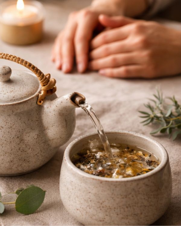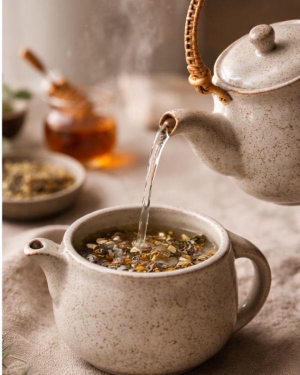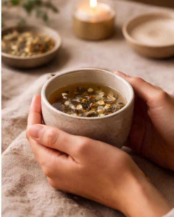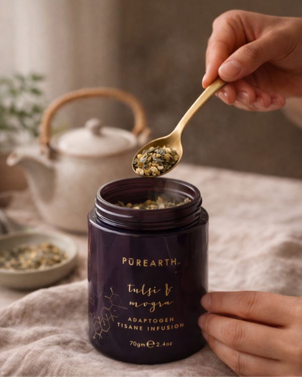 Adaptogen Tulsi & Mogra Tisane Infusion is a soothing herbal blend crafted to support balance, resilience, and everyday wellbeing. Whole-leaf Tulsi (Holy Basil), hand-harvested from the Himalayas, is revered in Ayurveda for its adaptogenic properties that help the body cope with physical, emotional, and environmental stress. Infused with fragrant Mogra (Arabian Jasmine), this calming tisane offers gentle floral notes and natural antibacterial benefits—making it a restorative daily ritual for mind, body, and soul.
