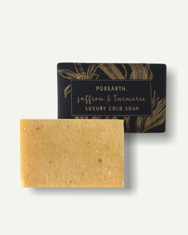 Turmeric & Saffron Luxury Cold Soap gently purifies and brightens the skin with Himalayan biodynamic turmeric and rare Kashmir saffron. Blended with bitter apricot, coconut, and olive oils, it cleanses without stripping while calming inflammation and enhancing natural radiance.
